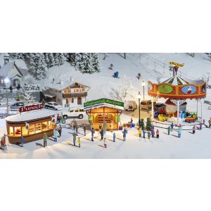 Inhoud: 2 alpenhuisjes, kapel, 3 verlichtingssokkels, ijspegels, sneeuwpoeder, witte verf.