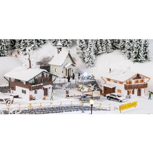 Inhoud: 2 kerstmarktkramen, draaimolen, Ijspegels, sneeuwpoeder, witte verf