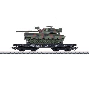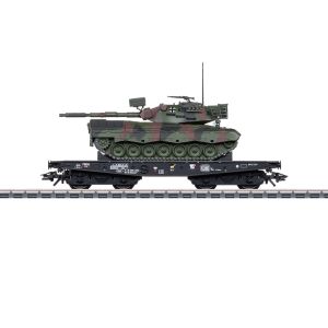 Rongenwagen type Kbs 443 van de Deutsche Bundesbahn (DB). Model zonder handrembordes. In gebruik voor het transport van militaire voertuigen.
