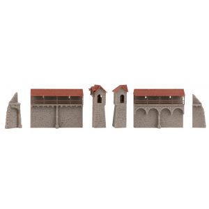 Modelset bestaande uit licht gerenoveerde verdedigingstoren met grijze hoekstenen en een tentdak, twee kleine verdedigingstorens en drie stadsmuurelementen met overdekte weergang en optionele ronde bogen.